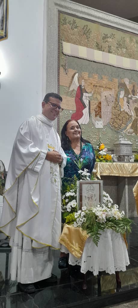 Giunto il momento, il parroco Nunzio Testa ha fatto menzione speciale di un dipinto della Vergine che abbiamo portato come esempio delle opere dell’artista plastica Rosaura Gonzalo e ha fatto un breve resoconto del Miracolo delle Lacrime di Sangue avvenuto sull’Isola Margherita. . Inoltre, abbiamo avuto un intervento di Yoly e Carmensol Mejía, in cui è stata raccontata tutta la storia accaduta.