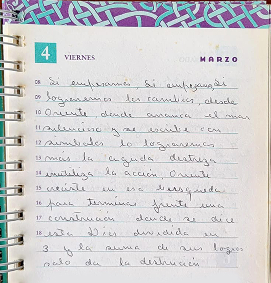 «Sí empezamos, sí empezamos, sí lograremos los cambios, desde Oriente, donde arranca el mar silencioso y se escribe con símbolos lo lograremos, más, la aguda destreza inutiliza la acción, Oriente creciste en esa búsqueda para terminar frente una construcción donde se dice está Dios dividida en 3 y la suma de sus logros solo da la destrucción. Muro absurdo de lamentos meciendo sus búsquedas, ¿en solitario baile? Y que encontraron aferrados a generaciones ancestrales siguiendo las ramas de árboles, con el orgullo de la estirpe, ¿y todo para qué?